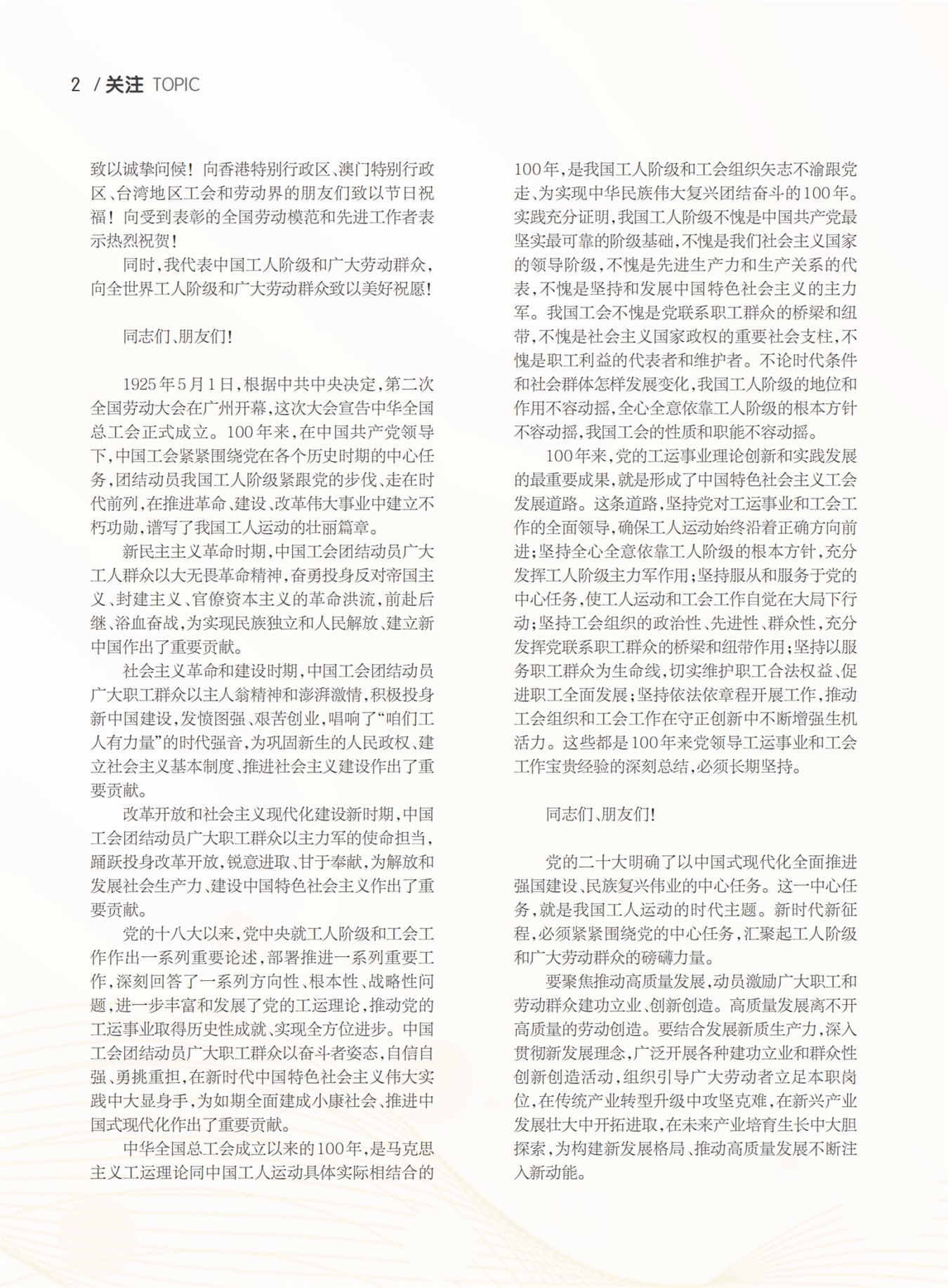 在庆祝中华全国总工会成立100周年暨全国劳动模范和先进工作者表彰大会上的讲话